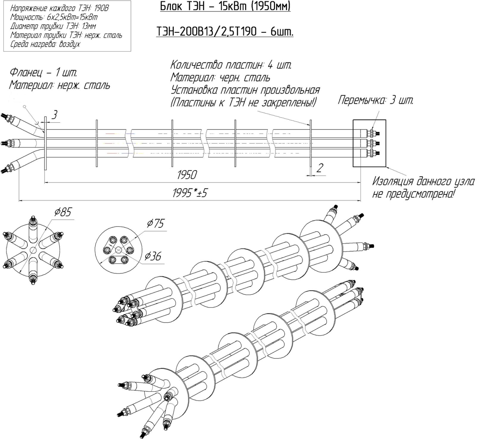 Блоки ТЭН - это блоки из нескольких ТЭНов на общем фланце. Они применяются для нагрева жидкостей и используются в водонагревателях, парогенераторах, котлах и в других промышленных и бытовых установках. Конструкция ТЭН-блоков представляет собой один или несколько двухконцевых трубчатых электронагревателей герметично закрепленных на общем фланце.