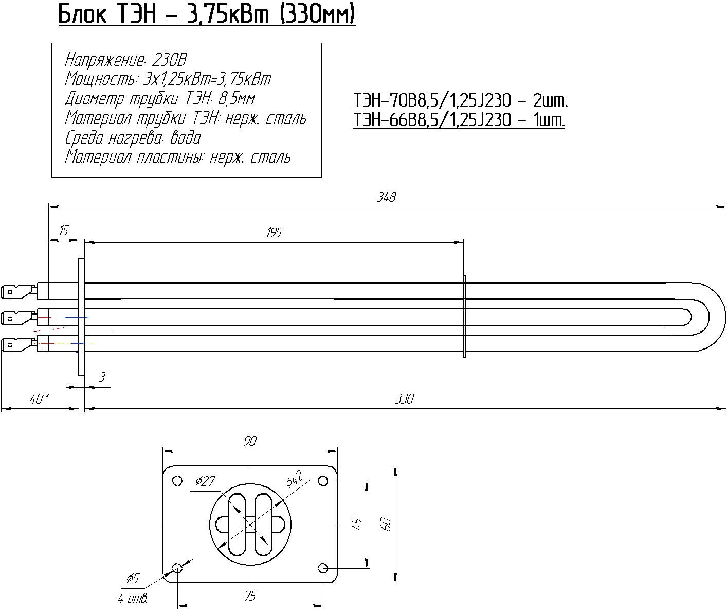 Особенностью блок ТЭНов является их сложная конструкция - за счет того что в блоке соединяет в рабочей группе от 3 нагревательных элементов на одном фланце за раз, такие ТЭНы отличаются высокой мощностью, а потому преимущественно применяются для комплектации как бытового, так и промышленного оборудования самого разного назначения.
