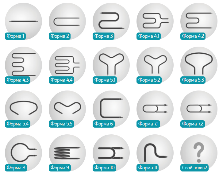- Вид форма. Наиболее популярными являются гнутые и прямые ТЭНы в различных плоскостях и конфигурациях — О-, U-, Y- и П-образные, спиралевидные и т. д.